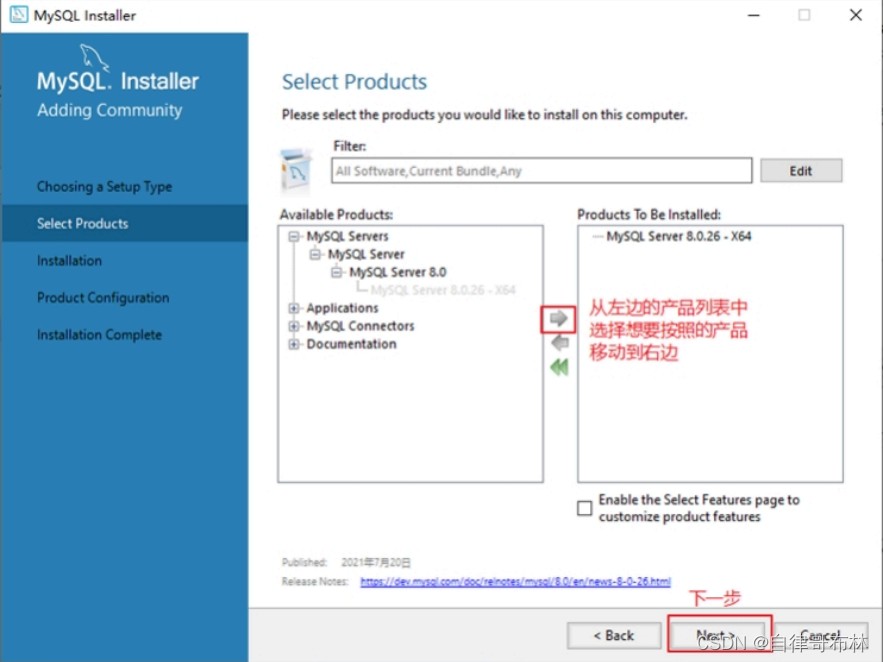 步骤3:打开“Select Products” (选择产品)窗口,可以定制需要安装的产品清单。例如,选择“MySQL Server 8.0.26-X64”后,单击“→”添加按钮,即可选择安装MySQL服务器,如图所示。采用通用的方法, 可 以添加其他你需要安装的产品。