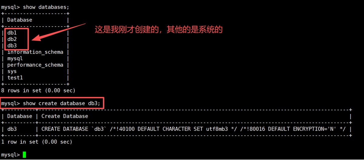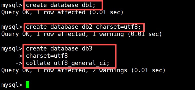 if not exists是可选项CHARACTER SET:指定数据库采用的字符集COLLATE:指定数据库字符集的检验规则