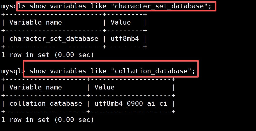 show variables like 'character_set_database'; show variables like 'collation_database';