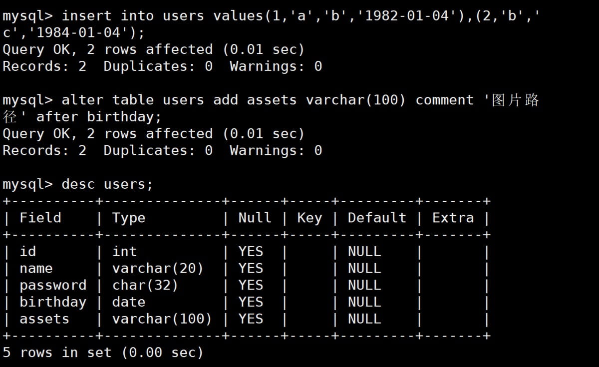 | 添加字段(图片路径) | alter table users add assets varchar(100) comment '图片路径' after birthday; | after birthday:指定字段插入在birthday后 |
