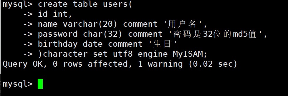 create table users ( id int, name varchar(20) comment '用户名', password char(32) comment '密码是32位的md5值', birthday date comment '生日' ) character set utf8 engine MyISAM;