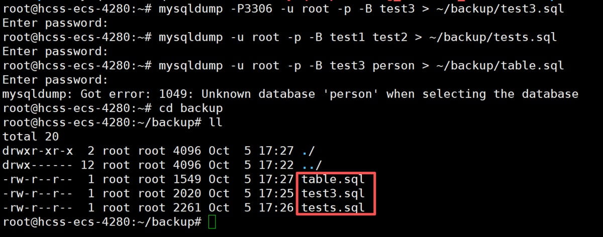 | 备份单库 | mysqldump -P3306 -u root -p密码 -B dbname > 数据库备份存储的文件路径 | 例子:mysqldump -P3306 -u root -p123456 -B test1 > ~/backup/test3.sql |