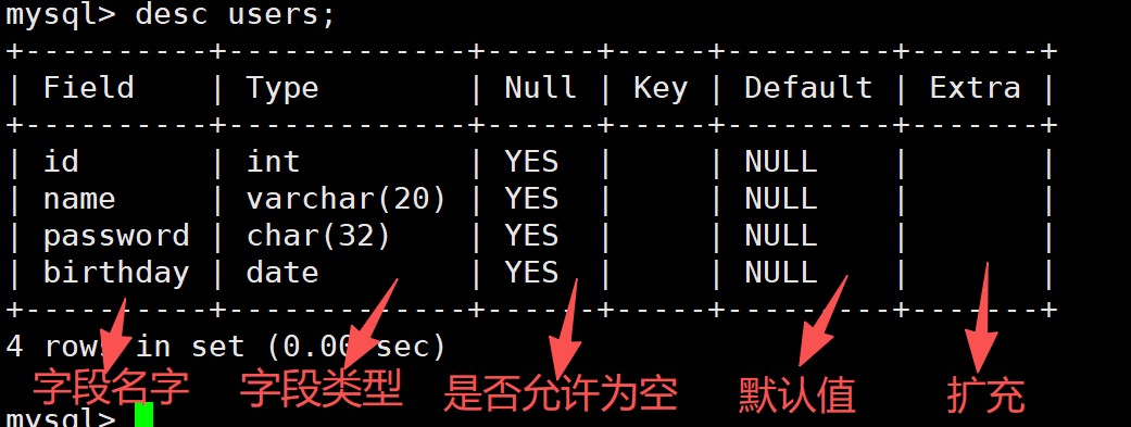 创建好表后,可通过desc命令快速查看表的字段信息: