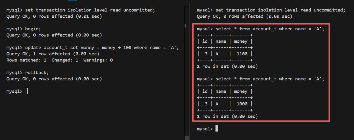 | 1 | SET @@tx_isolation='READ UNCOMMITTED'; | SET @@tx_isolation='READ UNCOMMITTED'; |