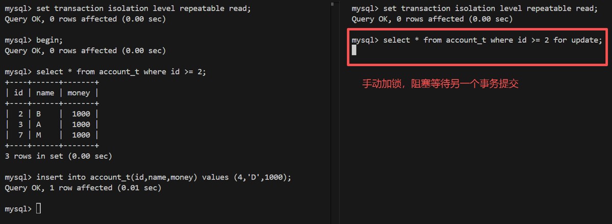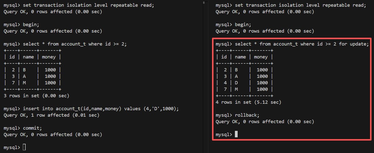 | 3 | SELECT * FROM account_t WHERE id >= 2 lock in share mode; | |