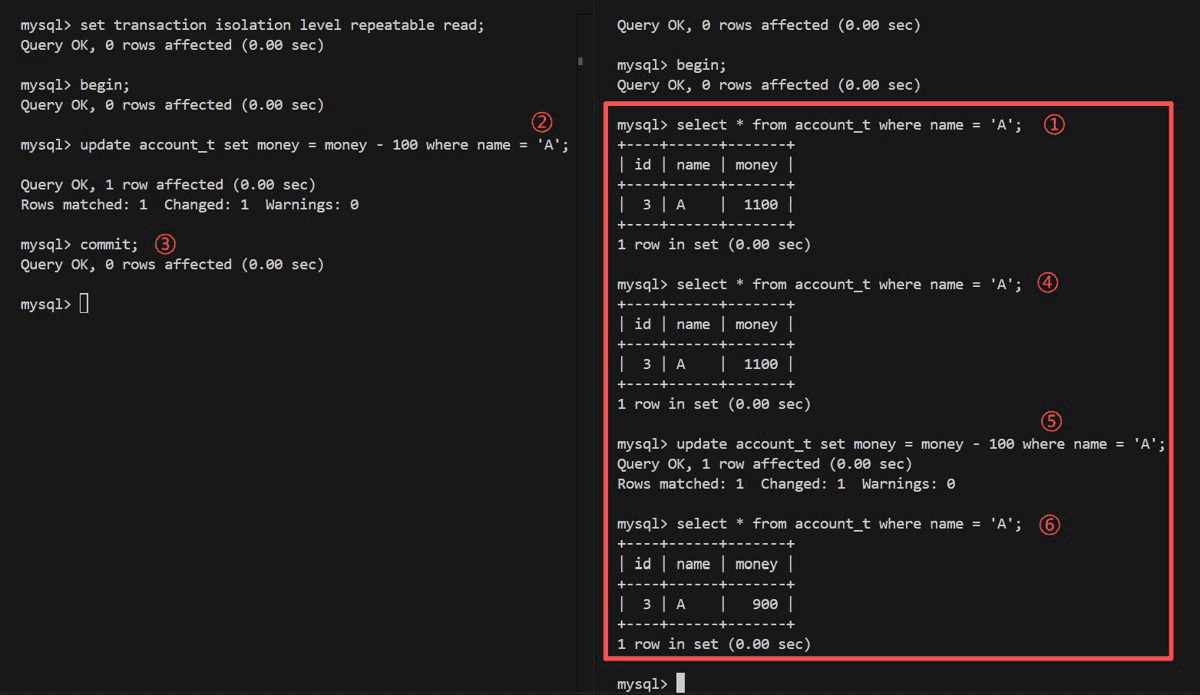 | 3 | UPDATE account_t SET money = money - 100 WHERE name = 'A'; | |