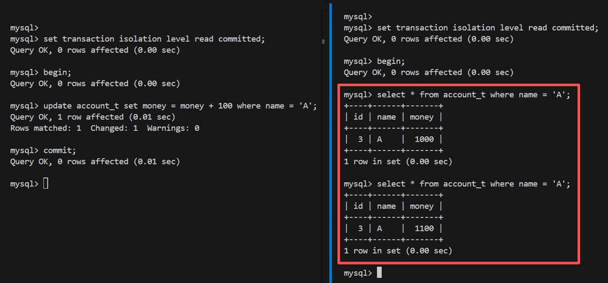 | 1 | SET @@tx_isolation='READ COMMITTED'; | SET @@tx_isolation='READ COMMITTED'; |