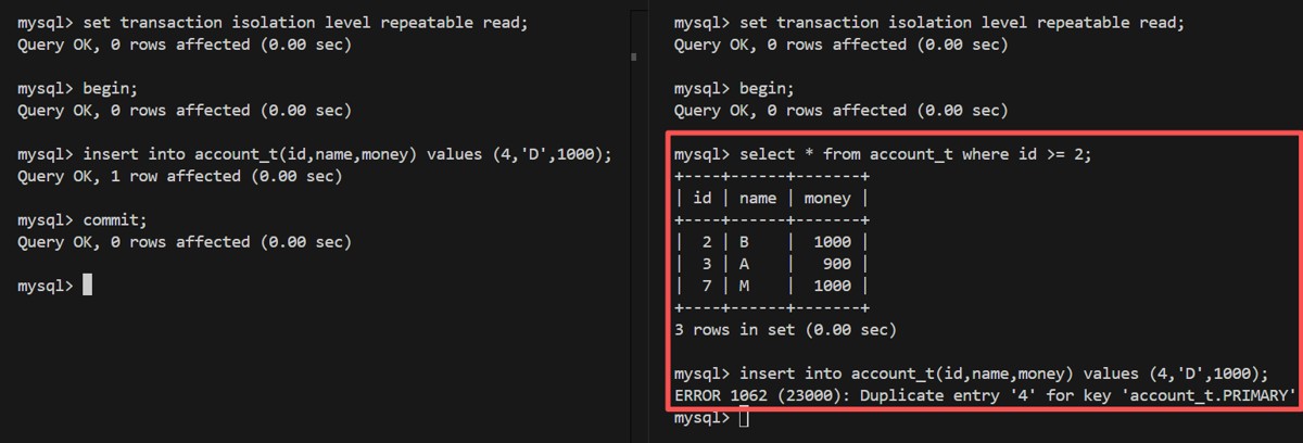 例如:以 name 为唯一键的表,一个事务中查询 select * from t where name = 'gulu'; 不存在,接下来 insert into t(name) values ('gulu'); 出现错误,因为此时另外一个事务也执行了 insert 操作;