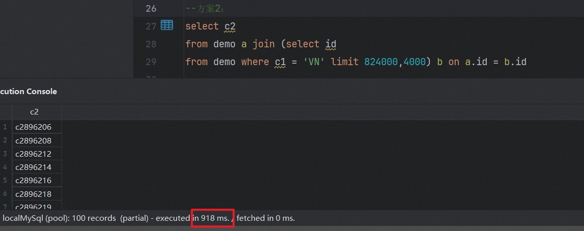 方案1: select user_id from user_info where venture = 'TH' limit 824000,4000 方案2: select user_id from user_info a join (select id from user_info where venture = 'TH' limit 824000,4000) b on a.id = b.id