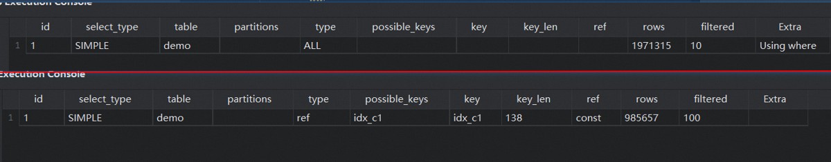 EXPLAIN FORMAT=JSON SELECT c2 FROM demo IGNORE INDEX (idx_c1) WHERE c1 = 'VN' LIMIT 824000,4000; IGNORE INDEX (idx_c1) 表示:强制不走索引查询