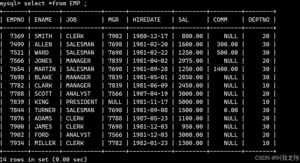 这个表是由笛卡尔积得到的,EMP表中的每个数据都与DEPT的数据进行一次匹配整合。