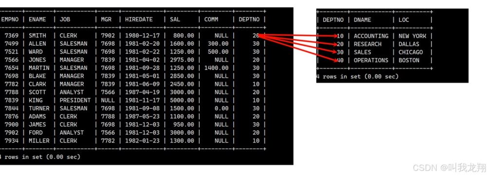 -- 用前面的写法 select ename, dname from EMP, DEPT where EMP.deptno=DEPT.deptno and ename='SMITH'; -- 用标准的内连接写法 select ename, dname from EMP inner join DEPT on EMP.deptno=DEPT.deptno and ename='SMITH';