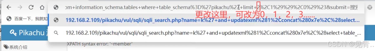 获取数据库表名,输入:k'and updatexml(1,concat(0x7e,(select table_name from information_schema.tables wheretable_schema='pikachu')),0)#,但是反馈回的错误表示只能显示一行,所以采用limit来一行一行显示