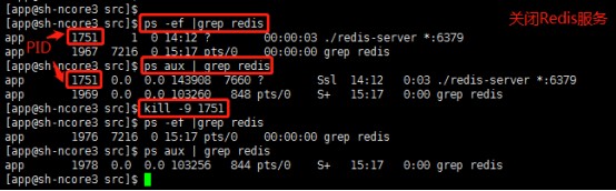 通过ps -ef | grep redis或ps -aux | grep redis查看Redis服务的PID,再通过 kill -9 PID 来关闭服务