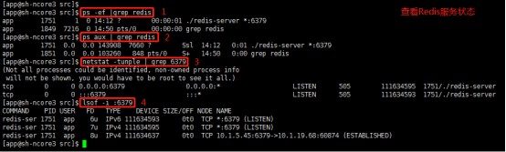 1.ps -ef | grep redis 2.ps -aux | grep redis 3.netstat -tunple | grep 6379 4.lsof -i :6379