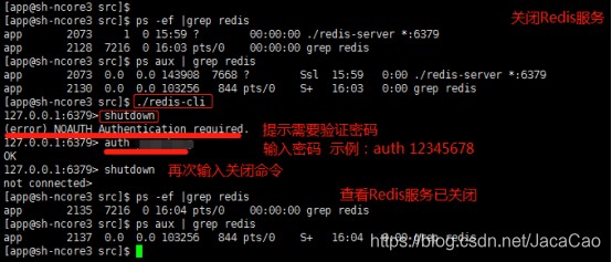 说明:输入关闭命令可能会提示需要验证信息<(error) NOAUTH Authentication required.>,只需输入密码就好了,假如密码为12345678。示例:auth 12345678
