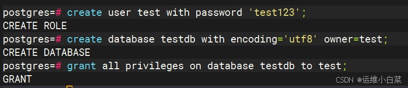 create user test with password ‘test123'; create database testdb with encoding=‘utf8' owner=test; grant all privileges on database testdb to test;