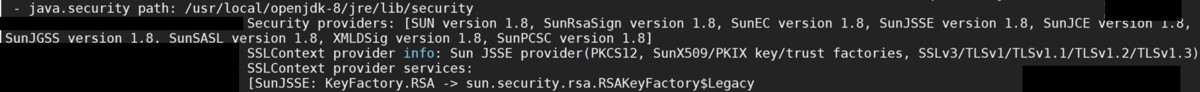 - java.security path: /usr/local/openjdk-8/jre/lib/security Security providers: [SUN version 1.8, SunRsaSign version 1.8, SunEC version 1.8, SunJSSE version 1.8, SunJCE vers1on 1.8, SunJGSS version 1.8, SunSASL version 1.8, ) XMLDSig version 1.8, SunPCSC version 1.8] SSLContext provider info: Sun JSSE provider(PKCS12, SunX509/PKIX key/trust factories, SSLv3/TLSv1/TLSvl.1/TLSvl.2/TLSvl.3) SSLContext provider services: