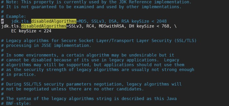 jdk.tls.disabledAlgorithms=SSLv3, RC4, DES, MD5withRSA,\ DH keySize < 1024, EC keySize < 224, anon, NULL, ECDH