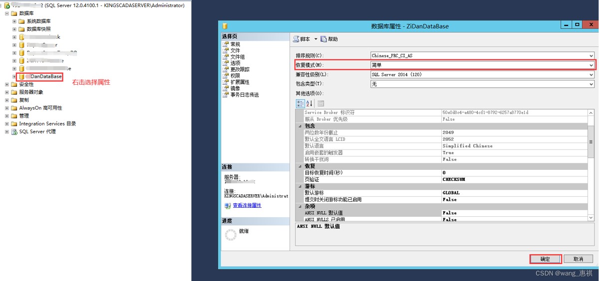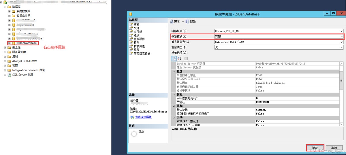 1、首先打开数据库,选择需要收缩日志文件的数据库右键选择属性点击选项将恢复模式完整改为简单点击确定。