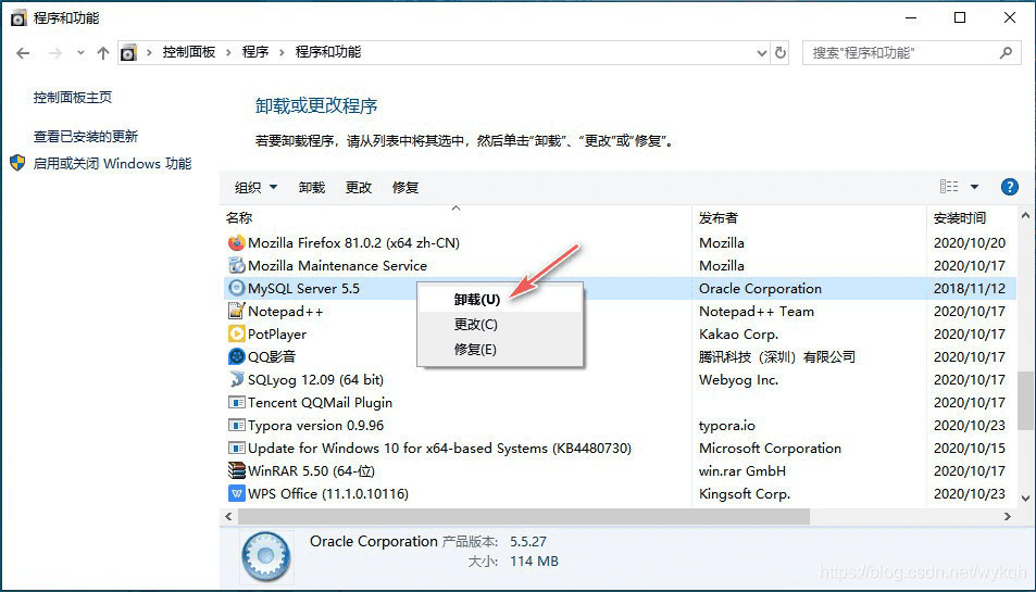 (2)右击应用卸载:控制面板 >> 程序和功能 找到MySQL Server5.5 右键点击卸载