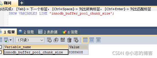 【注】:8388608/1024/1024=8MB, innodb_buffer_pool_chunk_size的值并不包含缓冲页对应的控制块的内存空间大小。