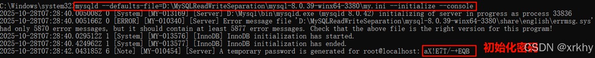 执行 mysqld --defaults-file=D:\MySQLReadWriteSeparation\mysql-8.0.39-winx64-3380\my.ini --initialize --console目录改为自己的,初始化数据库存储目录。