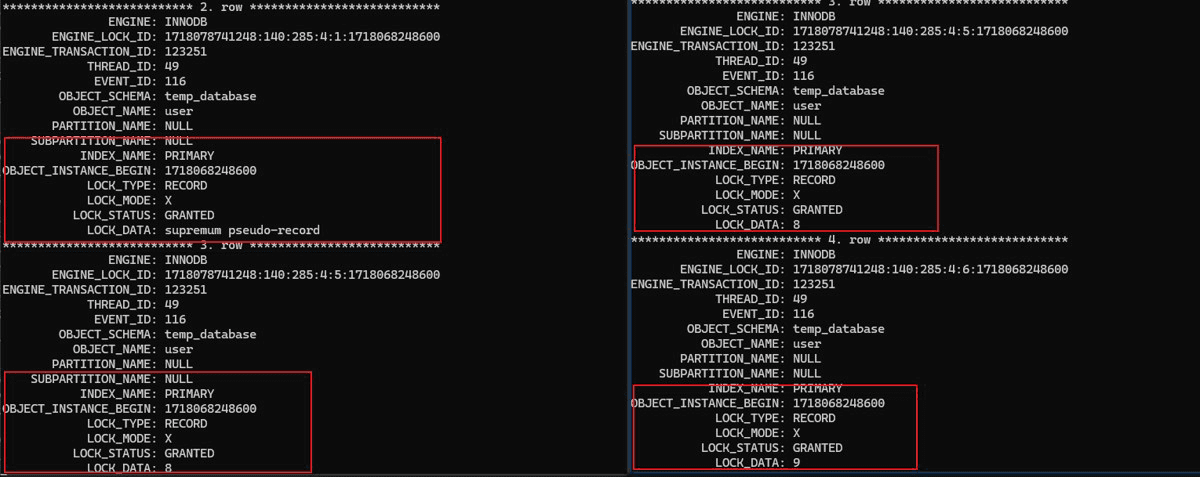 但是查询锁记录的时候,给我们看到的是给这个虚拟记录加了一个临建锁,可以这么认为是存在一个记录,这个记录永远不可以被查询到,就给supremum这条记录上了纯行锁,给(9,supremum)这条记录加了一个间隙锁