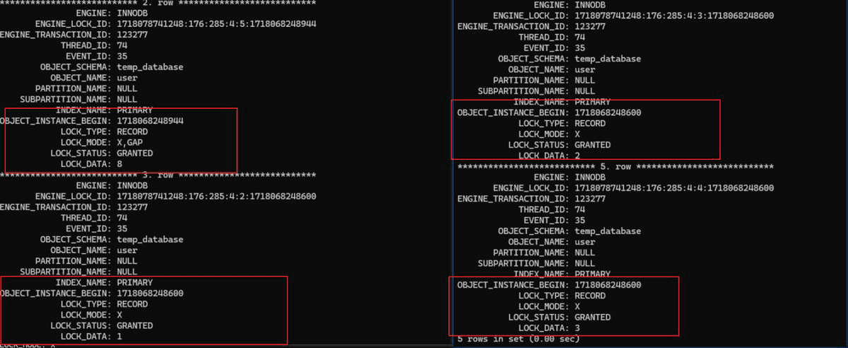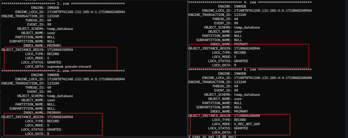 图中上锁的信息和端点在表中的相比,多了一个锁住以第一个大于查询条件的端点对应的值的值作为右端的间隙