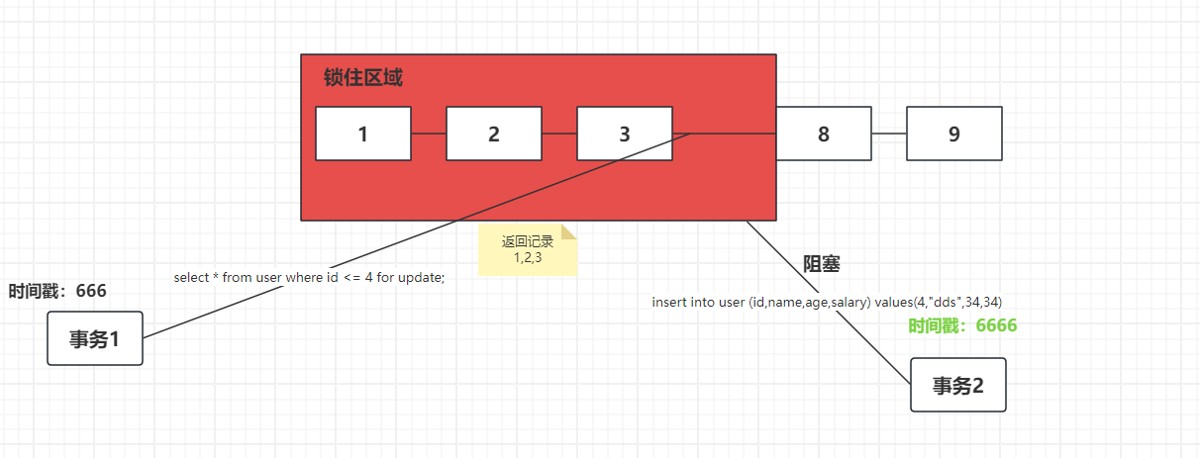 - id存在:会给所有小于条件的在表中存在的值加锁,给小于条件的第一条数据和条件之间加上间隙锁