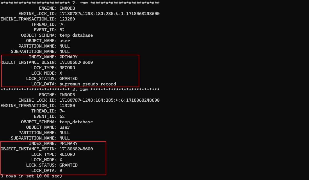可以看到这条语句是给user表加了一个意向排他锁,给 id为3这条数据加了一个纯行锁