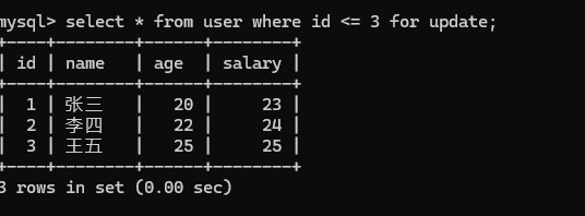 begin; select * from user where id <= 3 for update;