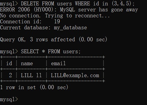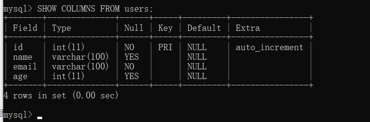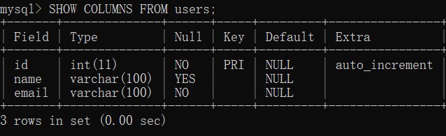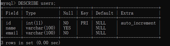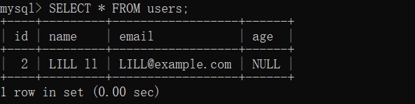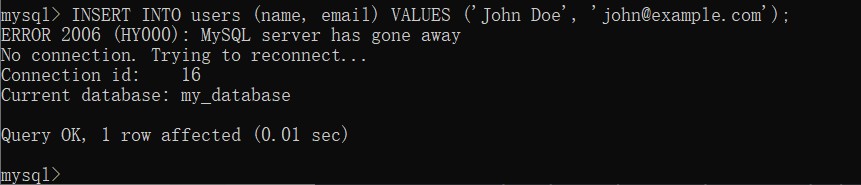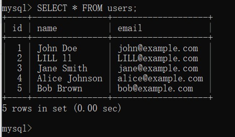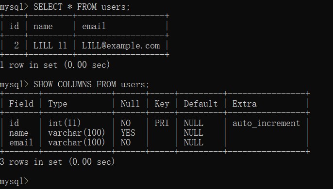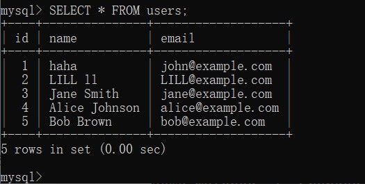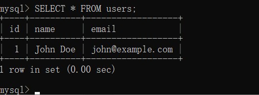 INSERT INTO users (name, email) VALUES ('John Doe', 'john@example.com');我这边谁便插入一个数据