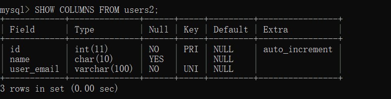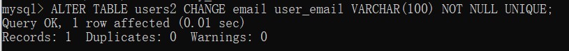 ALTER TABLE users2 CHANGE email user_email VARCHAR(100) NOT NULL UNIQUE;