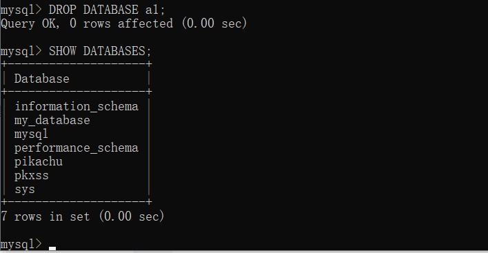 这里随便删一个数据库,我删我的a1数据库,然后使用SHOW DATABASES;命令查询刚刚删除操作是否成功,这里也是成功删除了。