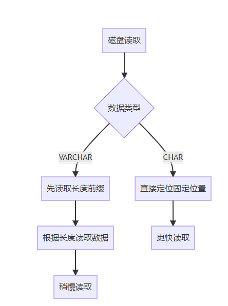 - 固定长度分配:无论实际数据长度如何,CHAR 都会分配指定长度的存储空间