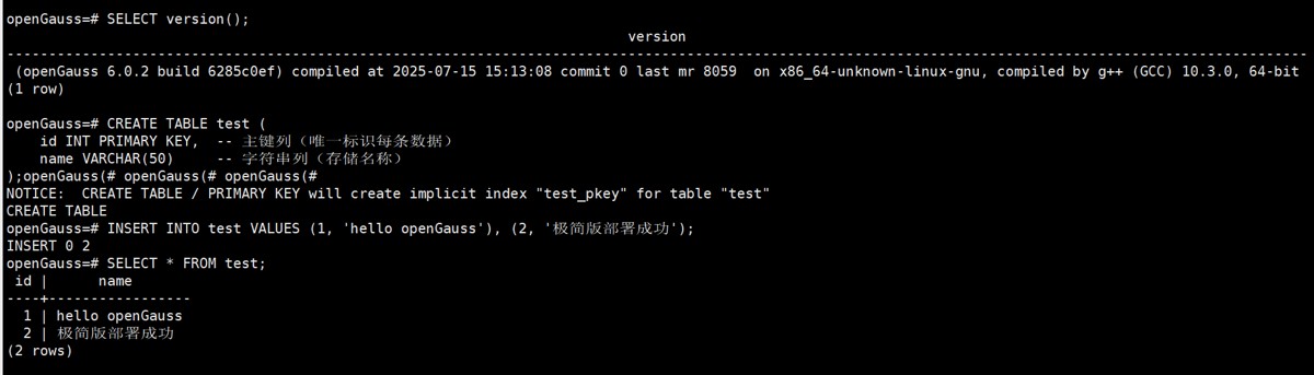 INSERT INTO test VALUES (1, 'hello openGauss'), (2, '极简版部署成功');