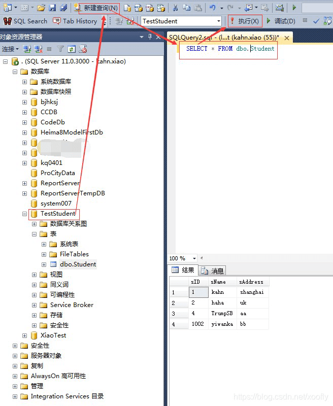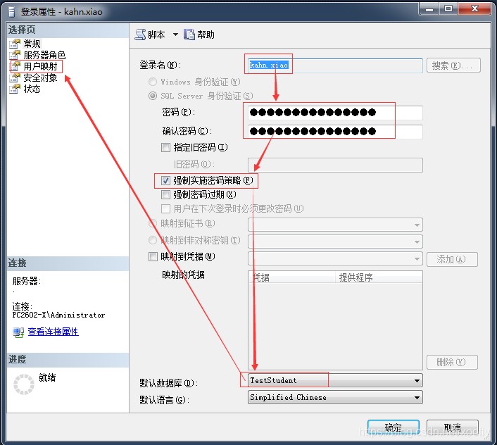 三、给sql server新建用户kahn.xiao,并赋予该用户对数据库TestStudent所有权限