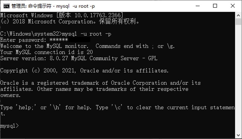 17.配置环境配置完成后,我们需要再次退出命令提示符,再次以管理员的身份运行cmd,在命令提示符中直接使用命令来登录root用户,来检查环境变量是否配置成功
