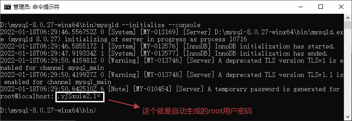 第二种:初始化时自动为root用户设置密码:mysqld --initialize --console