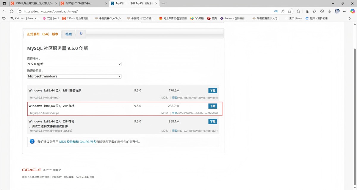 3.这里我们选择下载红色框中的压缩包,不建议选择MSI安装程序,避免后续使用过程中出现配置错误,这里我们以9.5.0版本为例