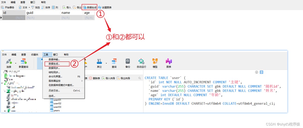 可以在数据表中或者Navicat上方的工具栏中找到数据生成工具