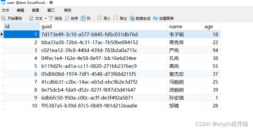 CREATE TABLE `user` ( `id` int NOT NULL AUTO_INCREMENT COMMENT '主键', `guid` varchar(255) CHARACTER SET gbk DEFAULT NULL COMMENT '随机id', `name` varchar(255) CHARACTER SET gbk DEFAULT NULL COMMENT '姓名', `age` int DEFAULT NULL COMMENT '年龄', PRIMARY KEY (`id`) ) ENGINE=InnoDB DEFAULT CHARSET=utf8mb4 COLLATE=utf8mb4_general_ci;