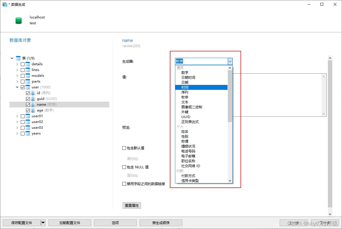 点击下一步,我们可以根据不同的数据类型,去选择不同的数据生成器,数据生成工具中提供了非常多的生成器来满足我们所需要的数据类型