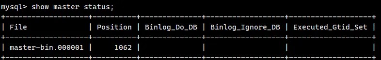 # 1 修改my.cnf配置 vi /etc/my.cnf # 写入 server-id = 1 log_bin=master-bin #开启二进制文件 log_slave-updates=true #开启从服务器日志同步 binlog-format=MIXED # 2 重启服务 systemctl restart mysqld # 3 设置myslave用户,用于主从复制 mysql -uroot -p123456 GRANT REPLICATION SLAVE ON *.* TO 'myslave'@'192.168.10.%' IDENTIFIED BY '123456'; flush privileges; # 4 查看master状态,日志名称和偏移量 show master status;