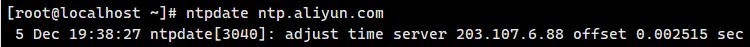 yum install ntp -y #先关闭ntp服务,同步阿里云时间。 #防止ntpd服务开启占用udP的123端口和ntpdate冲突,导致同步失败 systemctl stop ntpd ntpdate ntp.aliyun.com systemctl start ntpd