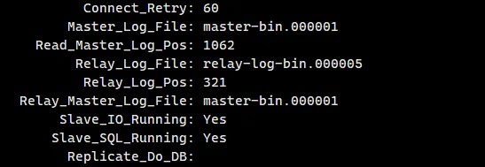#1设置数据库配置文件 vi /etc/my.cnf #写入 log_bin=master-bin #开启二进制日志文件 server_id = 22 #设置server_id。slave1为22,slave2 为23 relay-log=relay-log-bin # #从主服务器上同步日志文件记录到本地 relay-log-index=slave-relay-bin.index #定义relay-log的位置和名称(index索引) relay_log_recovery = 1 #保证了relay-log 的完整性 #2重启mysqld和登入mysql systemctl restart mysqld mysql -uroot -p123456 #3给「从节点」绑定「主节点」的同步信息 change master to master_host='192.168.10.105',master_user='myslave',master_password='123456',master_log_file='master-bin.000001',master_log_pos=603; #4开启从节点 start slave; #5、查看从服务器状态 show slave status\G;