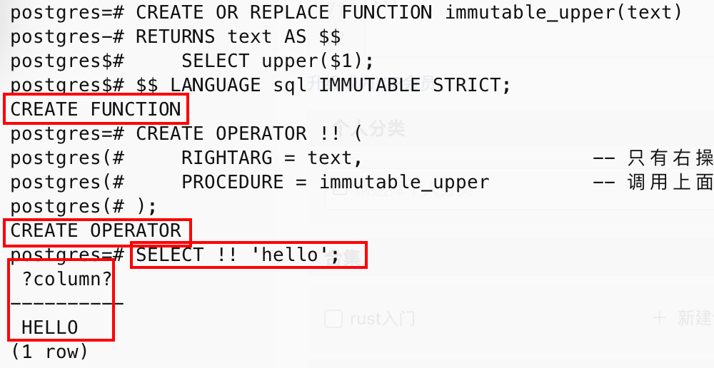 -- 第1步:先创建一个底层函数 CREATE OR REPLACE FUNCTION immutable_upper(text) RETURNS text AS $$ SELECT upper($1); $$ LANGUAGE sql IMMUTABLE STRICT; -- 第2步:创建前缀操作符(右操作数,没有左操作数) CREATE OPERATOR !! ( RIGHTARG = text, -- 只有右操作数,在右边 → 前缀操作符 PROCEDURE = immutable_upper -- 调用上面那个函数 ); -- 第3步:试用 SELECT !! 'hello'; -- 返回 HELLO SELECT !! column_name FROM users;
