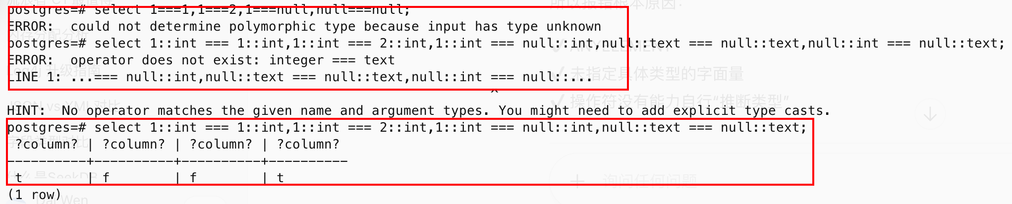 2️⃣这条语句执行时,PostgreSQL 内部会把 + 解析成一个真正的操作符对象,它的全名是 pg_catalog.+(在系统目录 pg_operator 里能查到)。而1️⃣就是把平时隐藏的内部机制直接写出来了,只不过是用最“啰嗦、最底层”的方式调用加法操作符,你可以把 OPERATOR(schema.操作符名) 理解成“强制指定用哪个操作符来操作左右两边”。