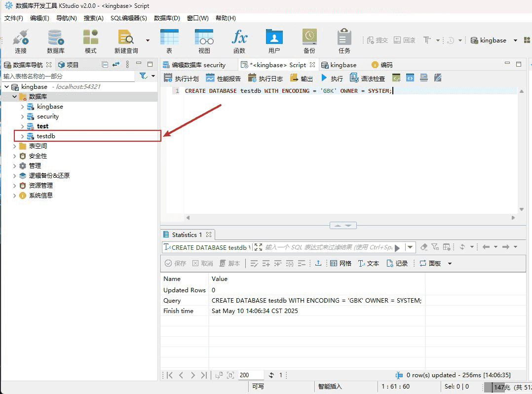 CREATE DATABASE testdb WITH ENCODING = 'GBK' OWNER = SYSTEM;